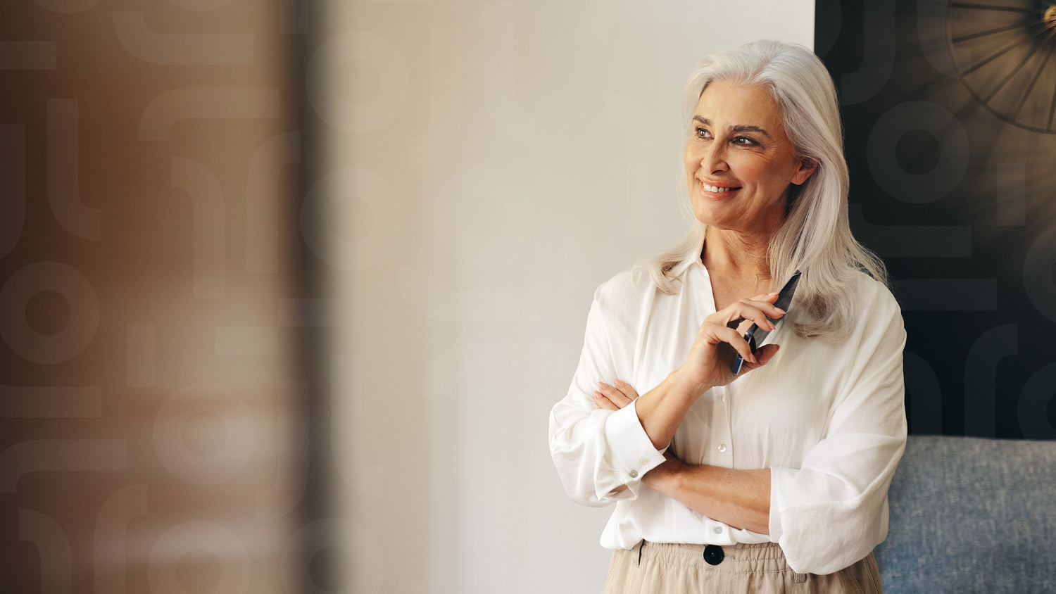 Senior woman standing in her living room with a mobile phone in her hand, reflect on her life and experiences. Mature woman spending her leisure time at home after retirement.