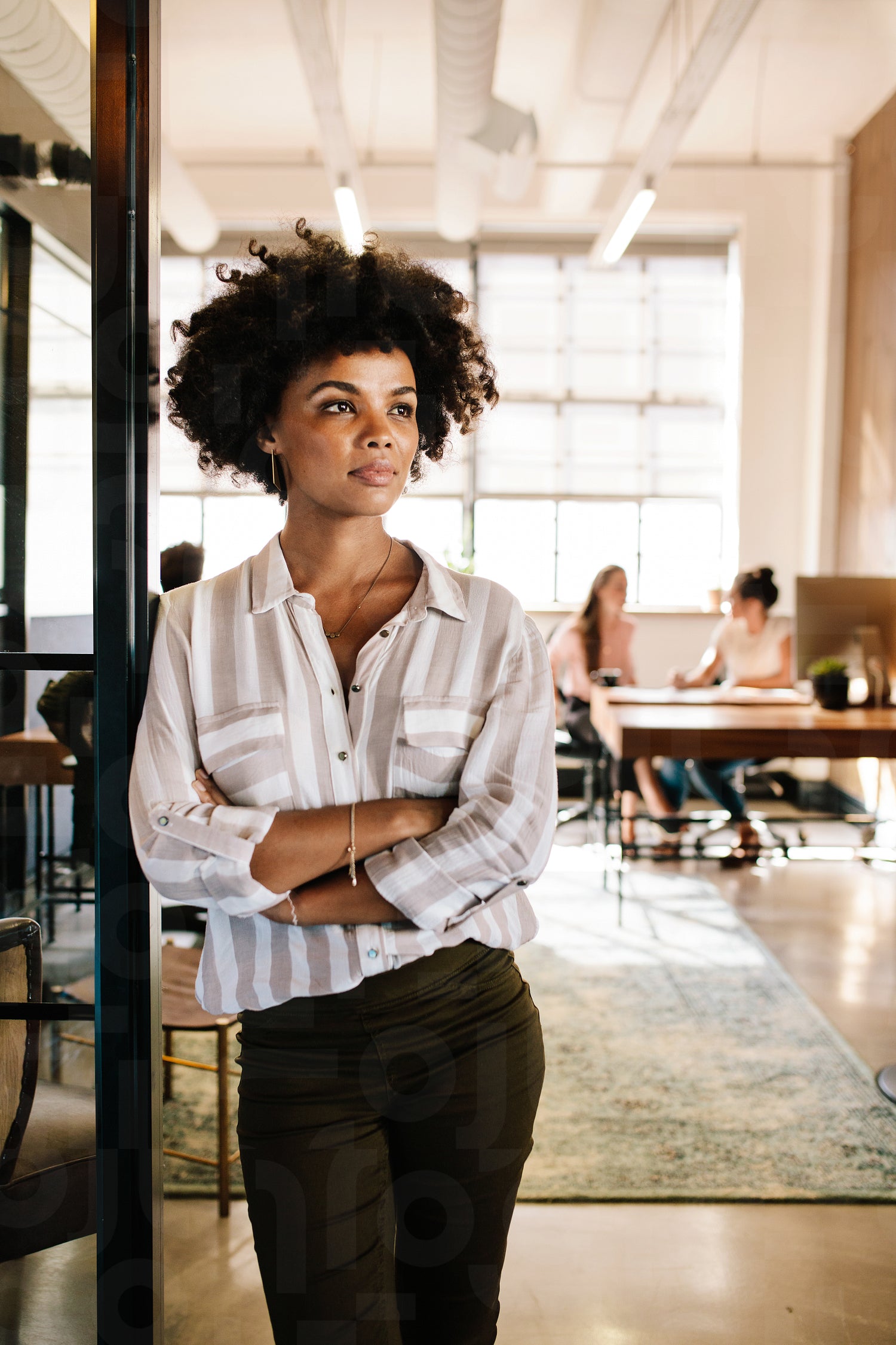 Portrait of young african woman leaning to office doorway and looking away. Thoughtful female executive at office with people working in background.