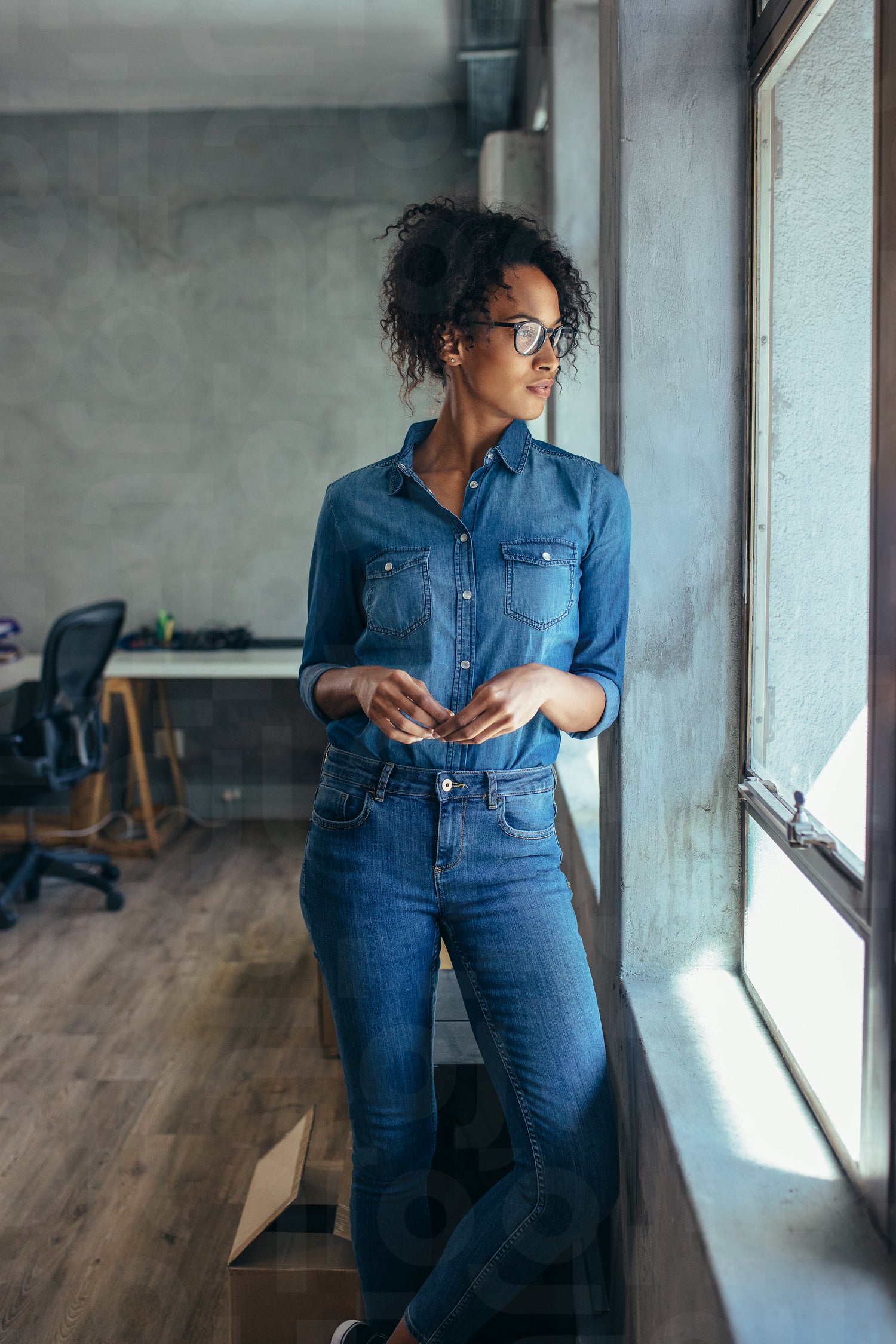Woman entrepreneur standing in office and looking out the window. Businesswoman in casuals standing near window in office.