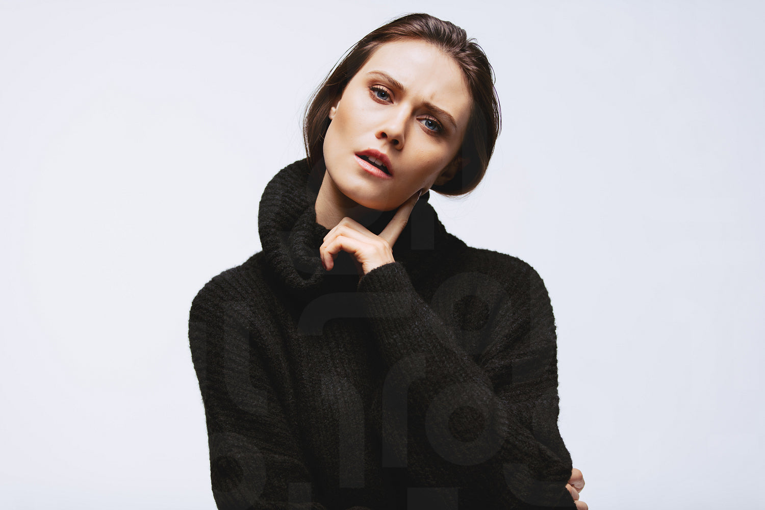 Portrait of young woman in black cardigan with finger on cheek. Caucasian female model staring at camera. Beautiful caucasian female with thoughtful facial expression against white background.
