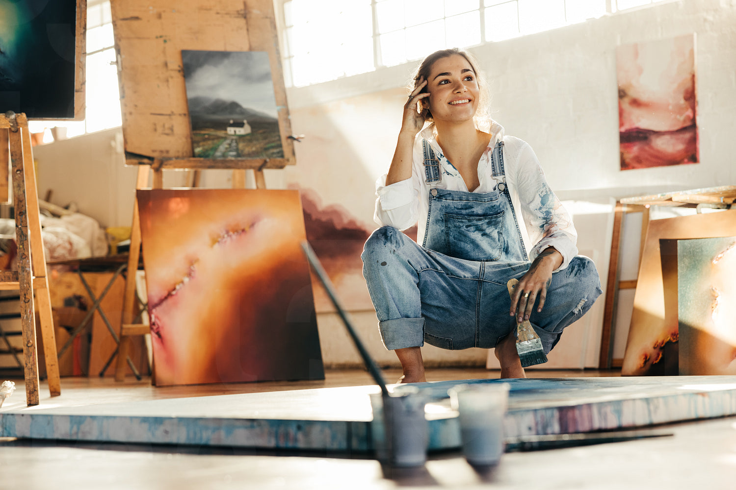 Thoughtful young artist smiling in her studio. Happy young painter contemplating new creative ideas while squatting near her painting on the floor. Female painter making a new painting on a canvas.