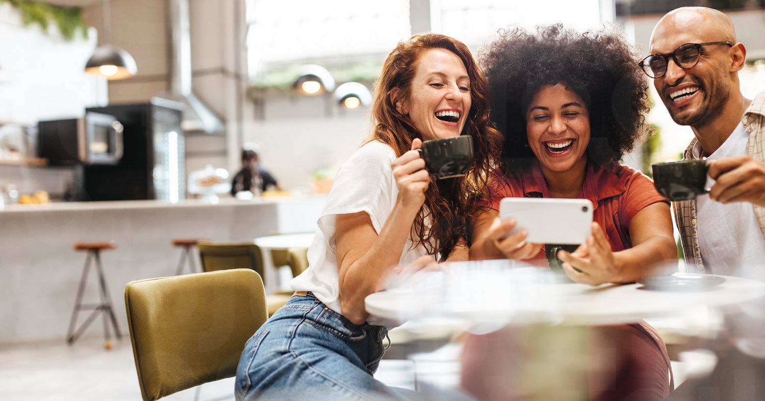 Fun friends raising their coffee cups while video chatting with the rest of their circle on a smartphone. Group of happy young people having a good time in a trendy cafe.