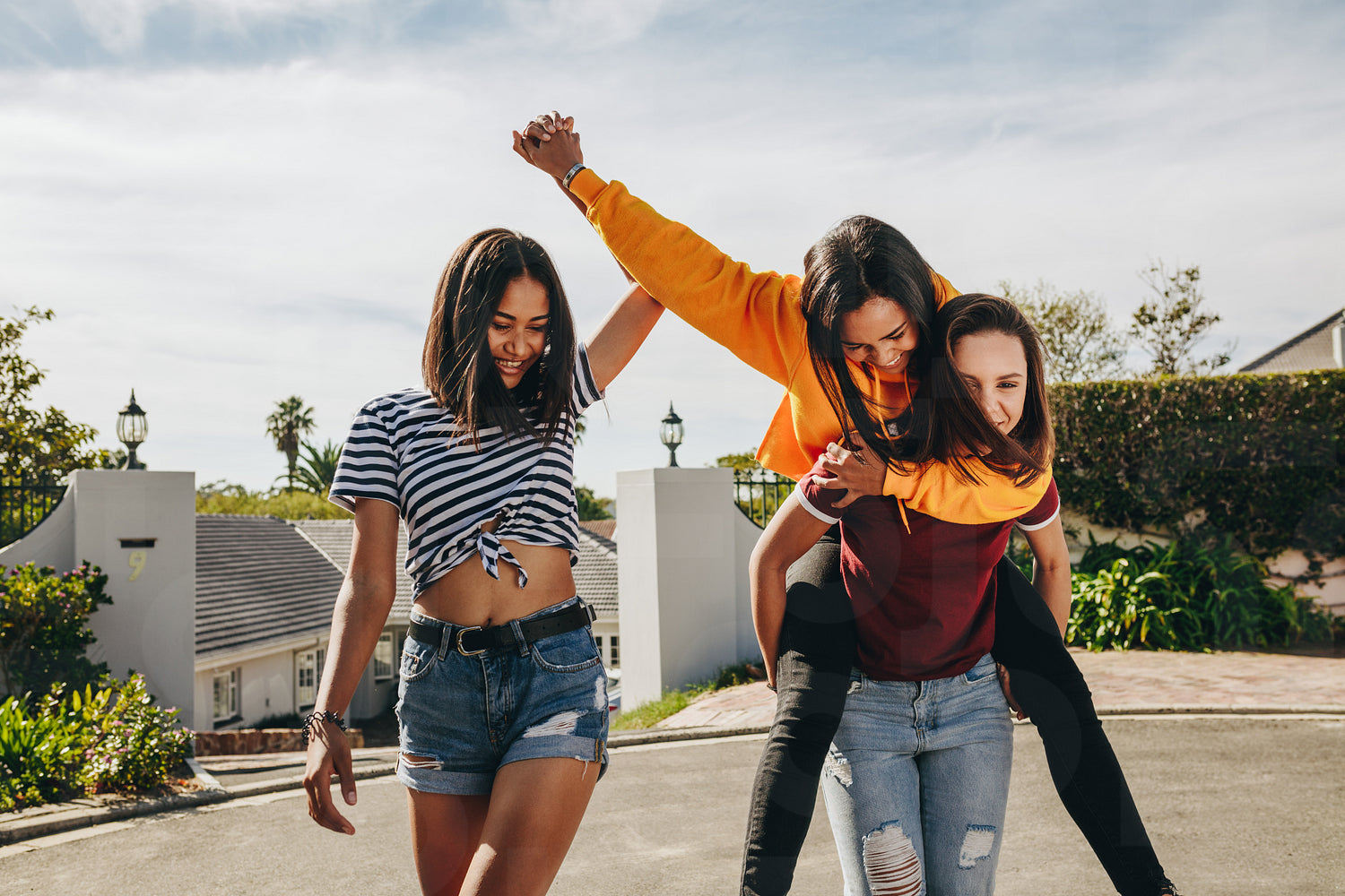 Young girl piggy riding on her friend while walking in the street on a sunny day. Teenage girls playing and having fun in the street.