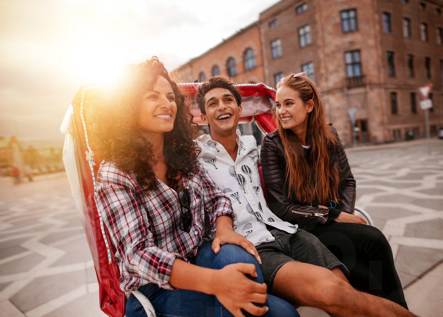 Three young people having fun on tricycle in the city