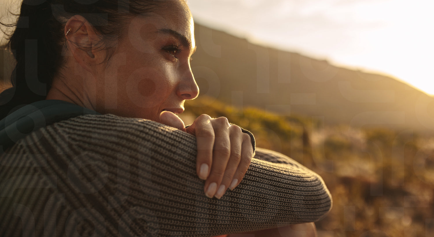 Close up of young woman taking break during hiking. Female hiker taking rest and thinking.