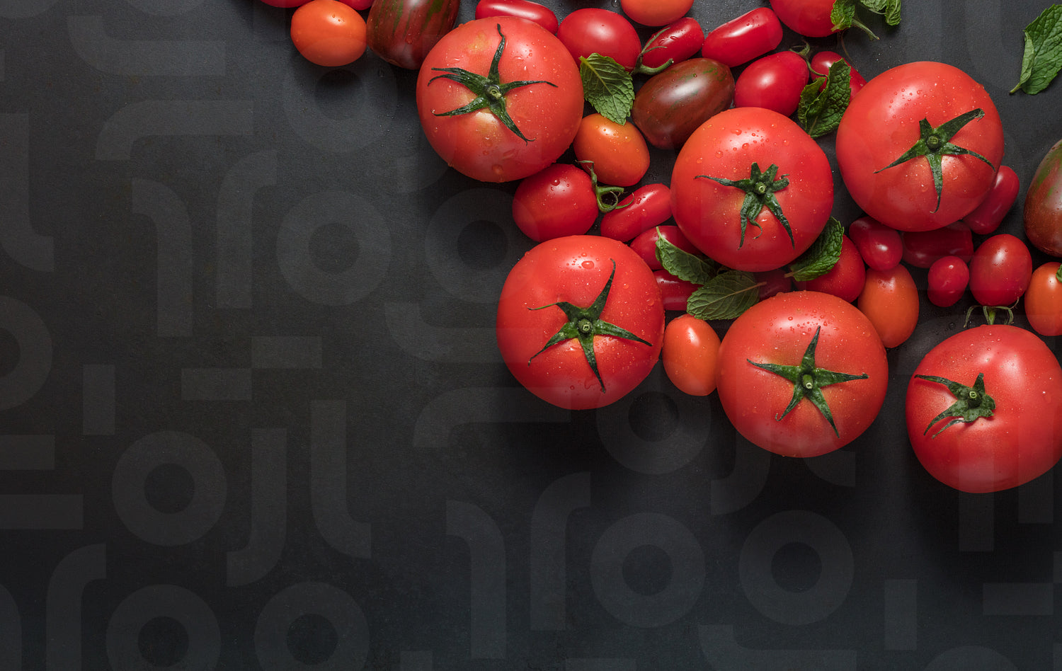 Ripe tomatoes along with mint on black background. Big and small sized tomatoes placed together on a table.