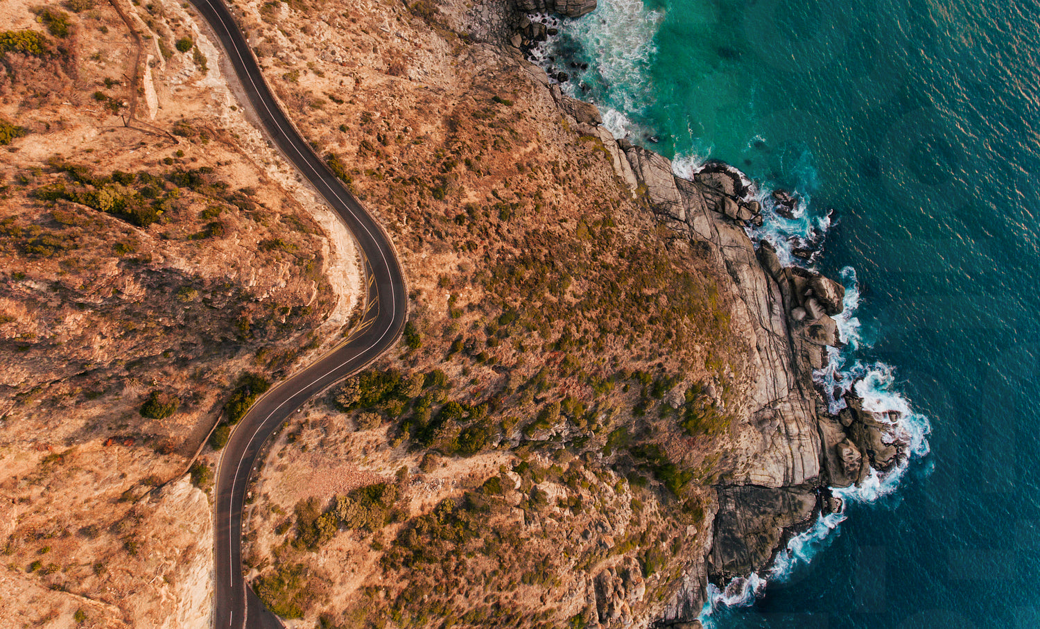 Top view of road going through beautiful landscape. Road bending along the ocean.