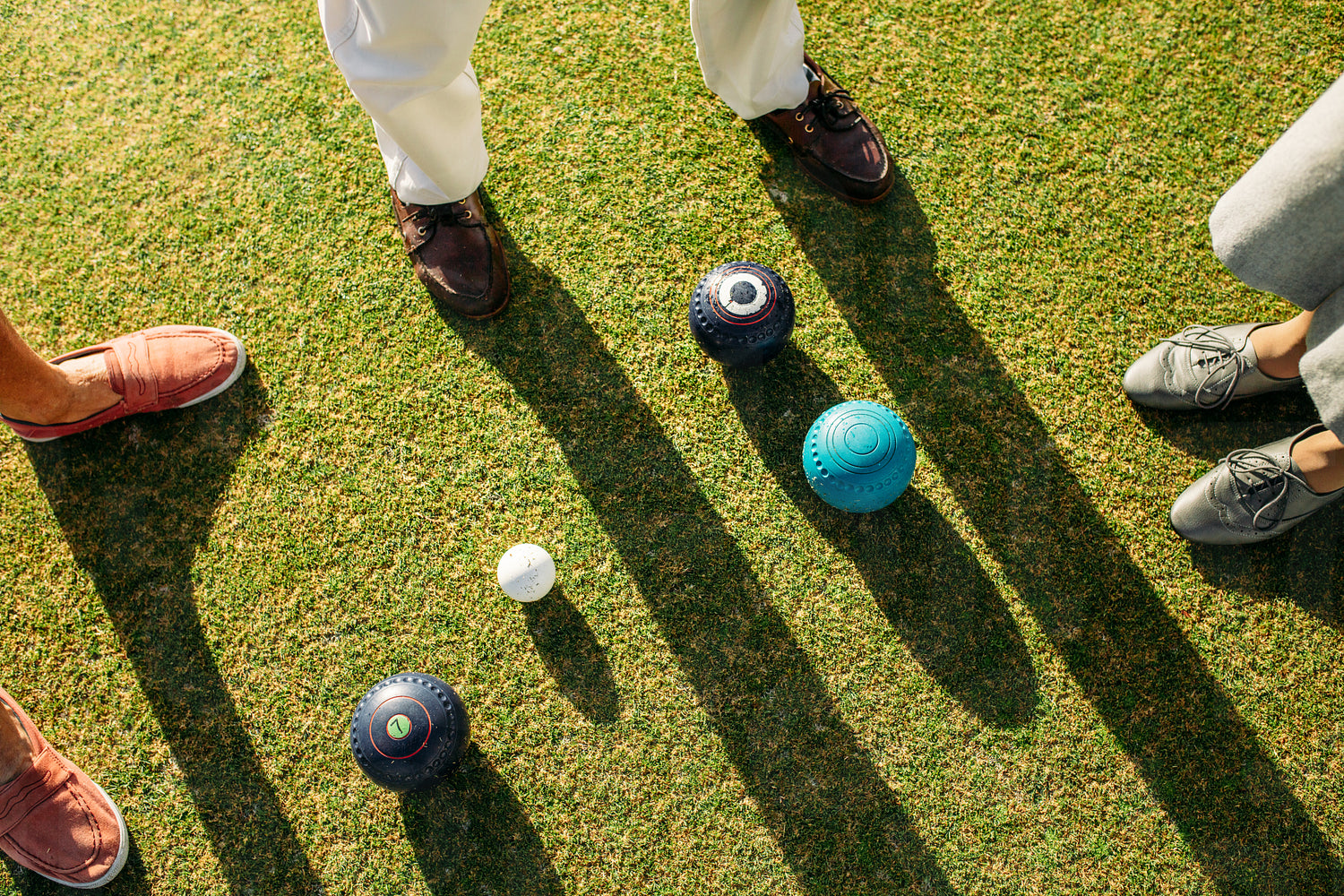Close up shot of boules on ground with the feet of people standing around them. People standing near the boules to see the result at the end of the game.
