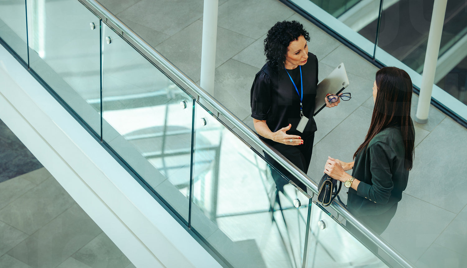 A high-angle view showcases two colleagues engaging in discussion in a contemporary office setting. The conversation appears professional, with one holding a laptop.