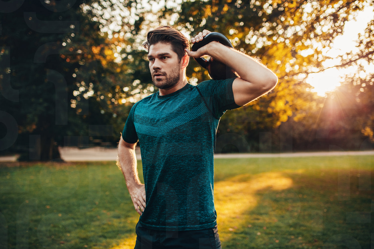 Portrait of tough young guy exercising with kettlebell in park. Fit man training at park in morning.
