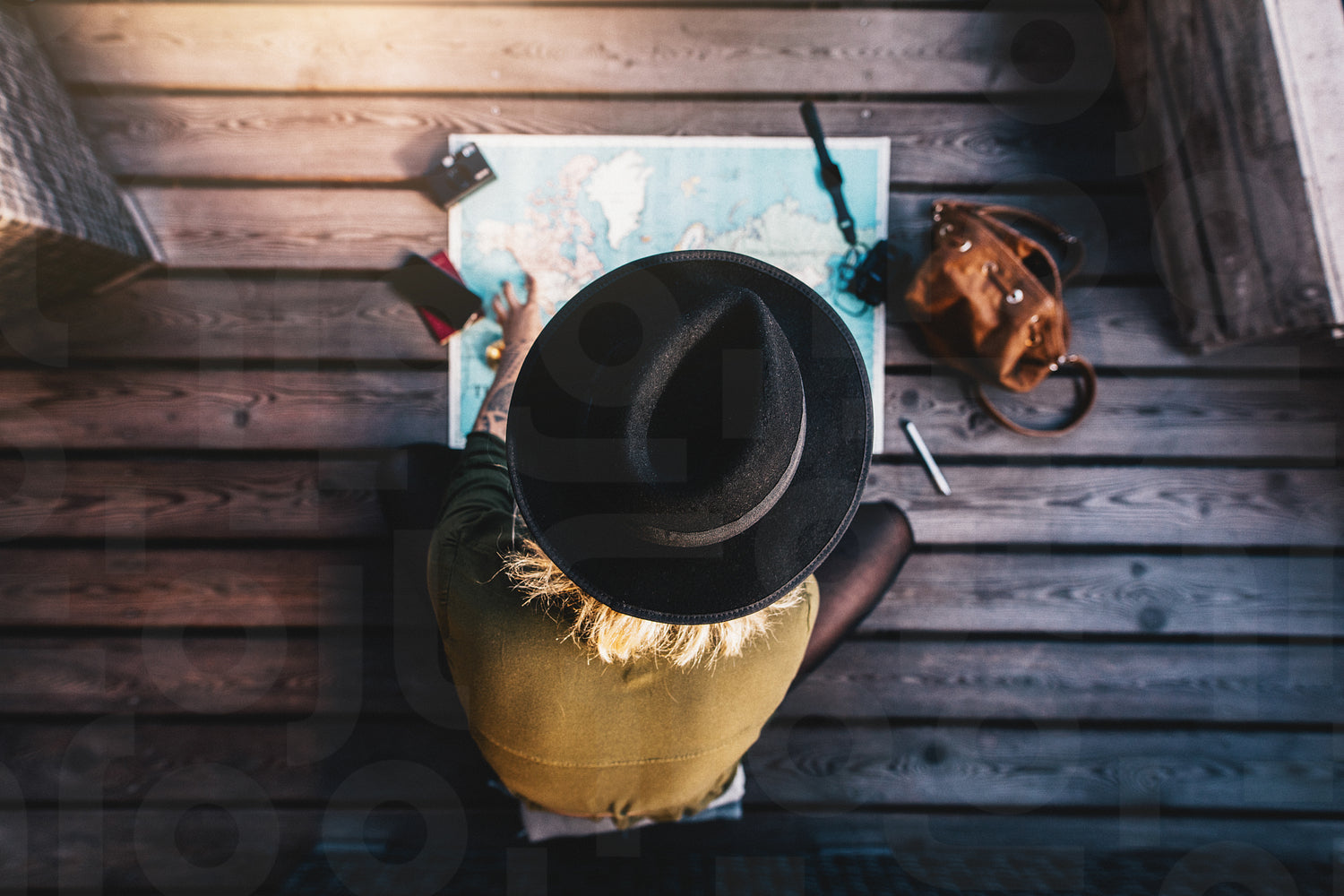 Top view of woman wearing hat looking at the world map. Tourist sitting on wooden floor exploring the world map.