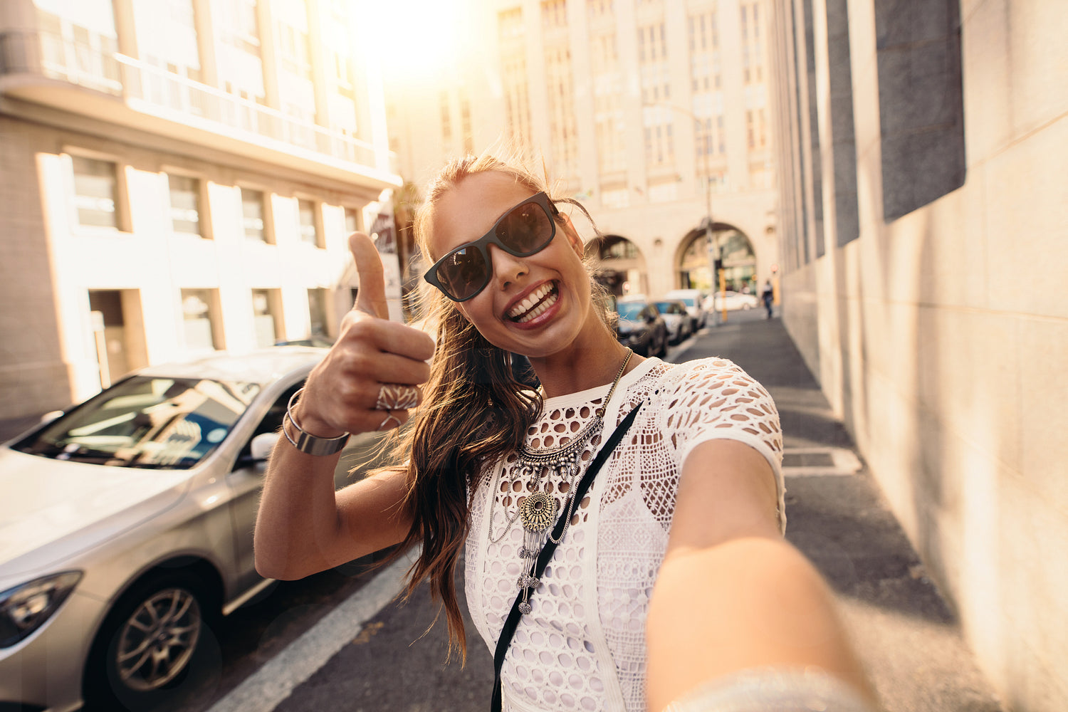 Tourist posing for a selfie in a street flashing thumbs up sign. Vlogger recording content for her travel vlog.