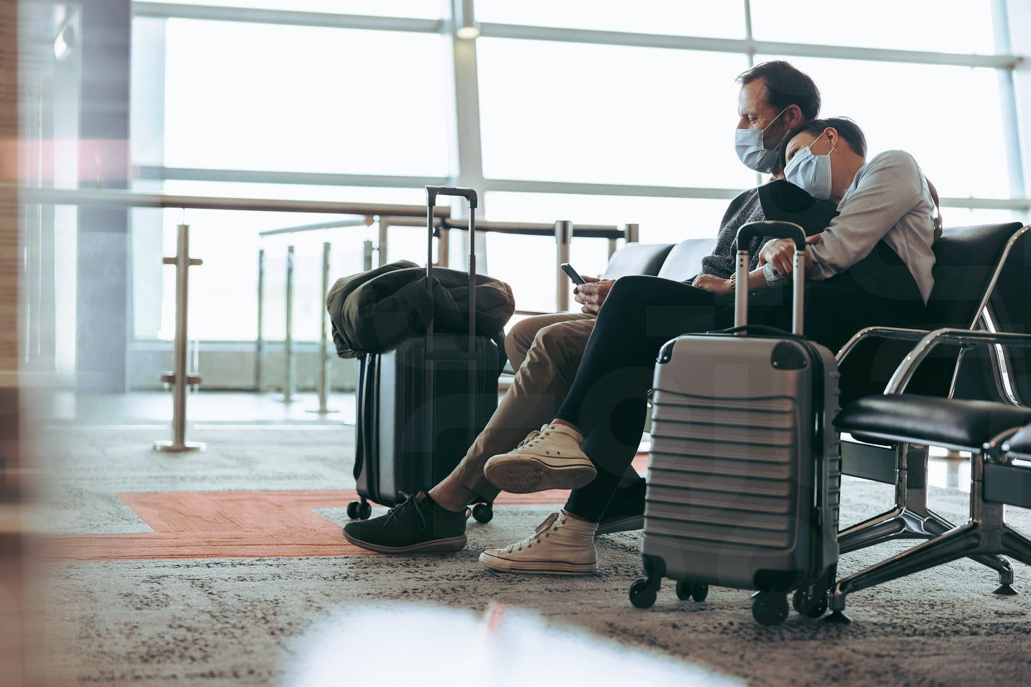 Couple wearing face masks sitting at airport terminal and waiting for the flight. Man using cell phone sitting next to woman at airport during corona virus pandemic.