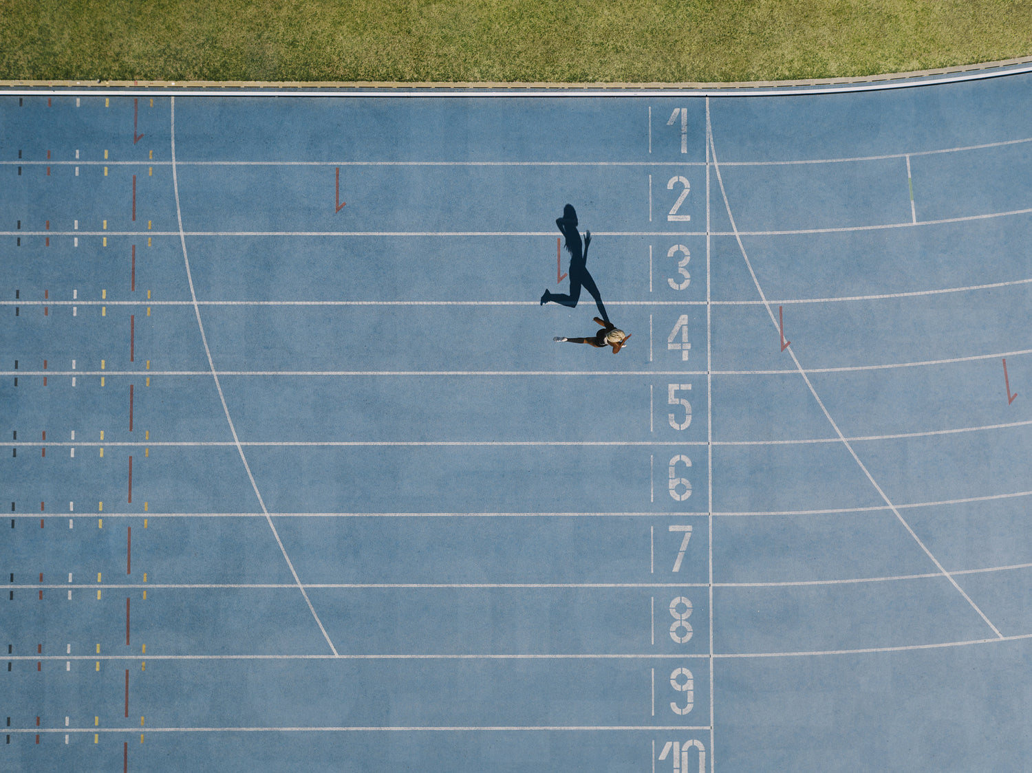 Female sprinter running on athletic track nearing the finish line. Top view of a sprinter running on race track in a stadium.