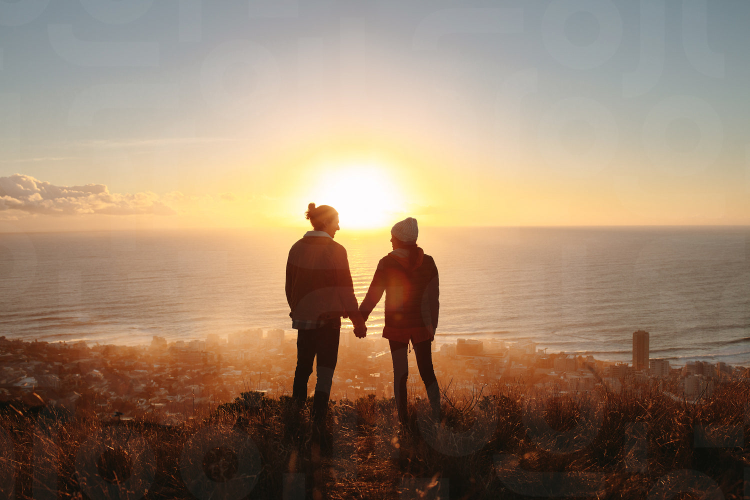 Silhouette of man and woman holding hands and standing on the mountain peak at sunset. Traveling couple on cliff at sunset.