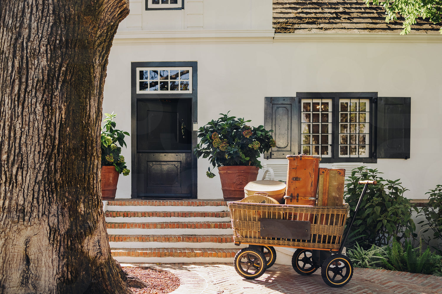 Travelling bags placed in a trolley cart at a hotel. Still life shot of a trolley cart with luggage outside a hotel entrance.