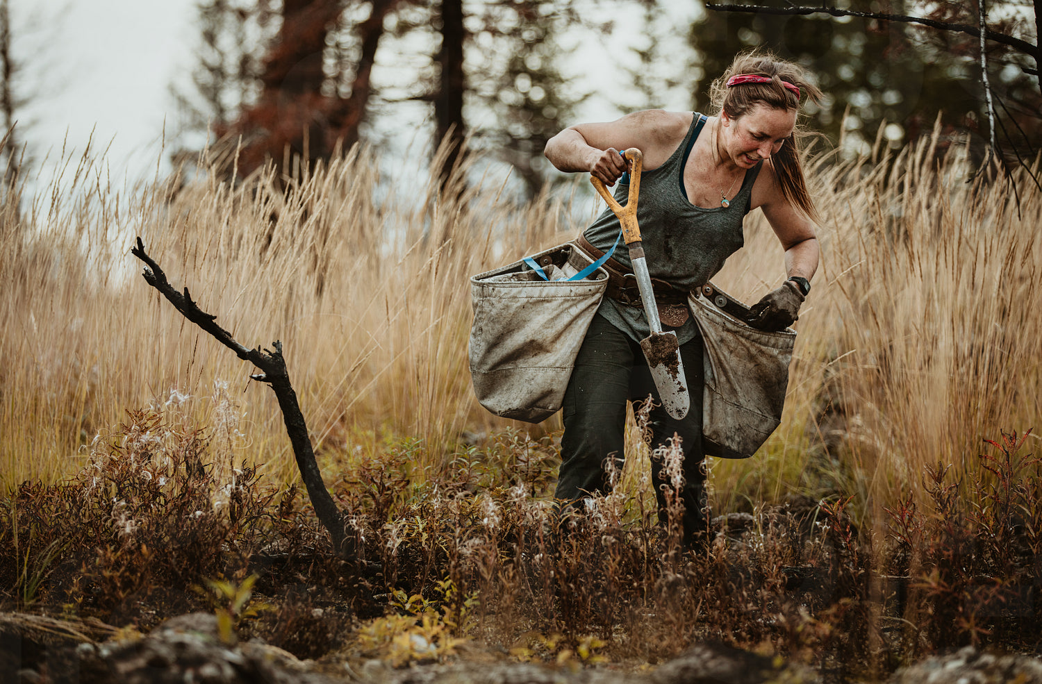 Woman digging hole in forest to plant saplings. Female planting new trees in forest.