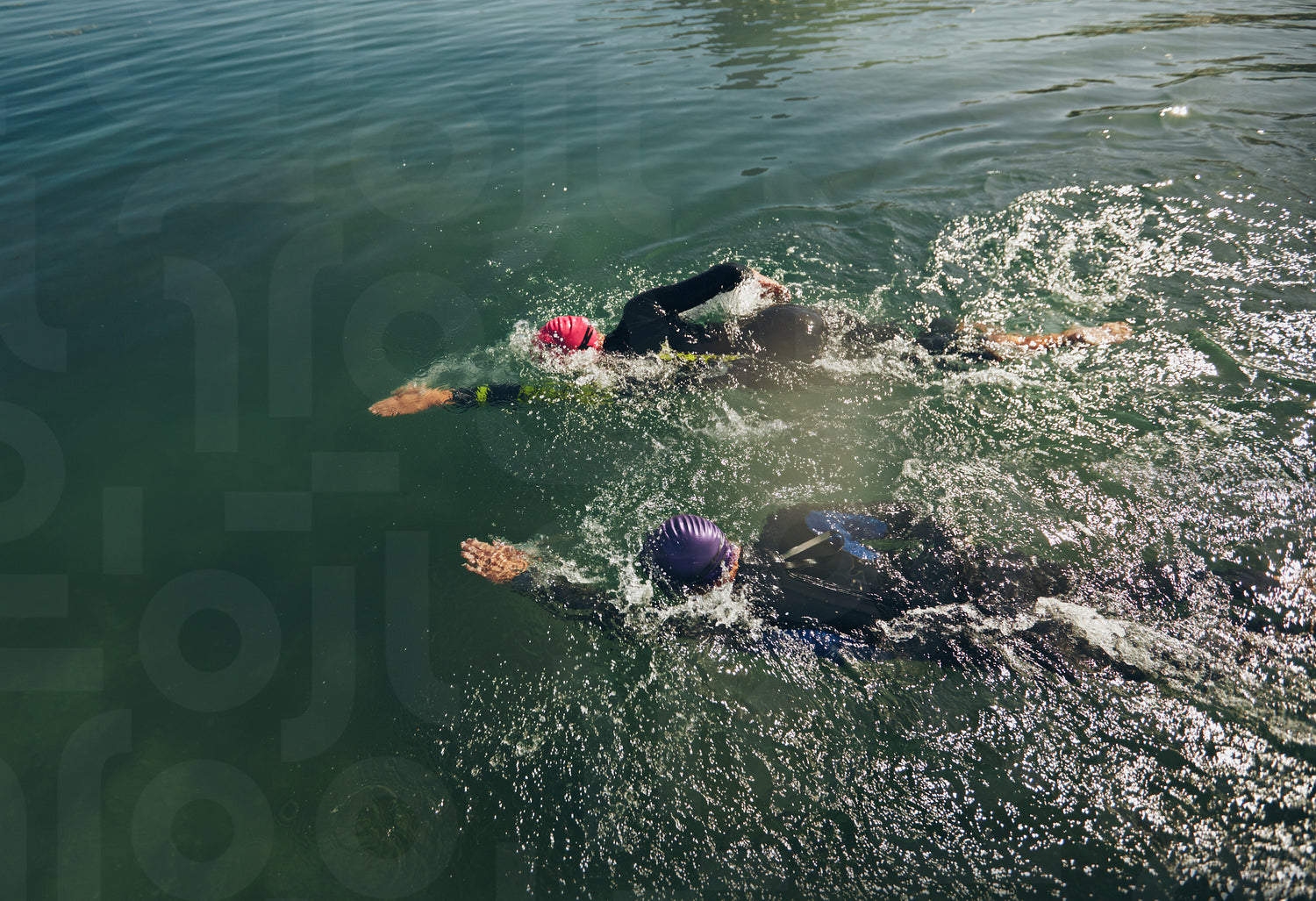 View of swimmers in water. Triathlon participants practicing for swim event.