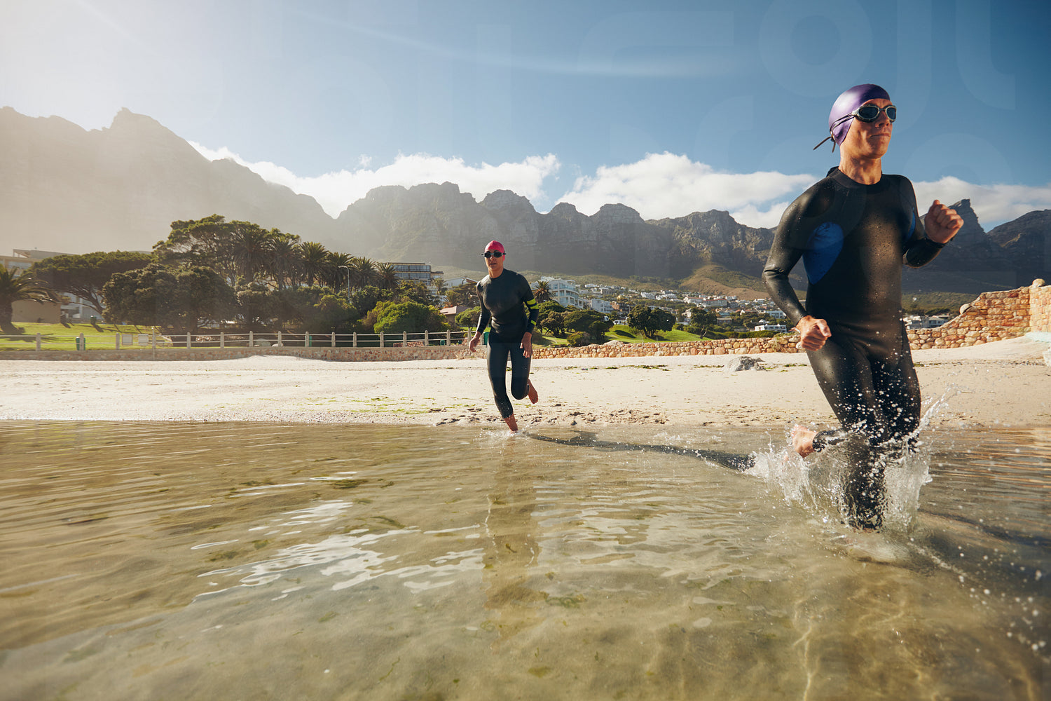 Two athletes training for a triathlon. Triathlon participants running in the water.