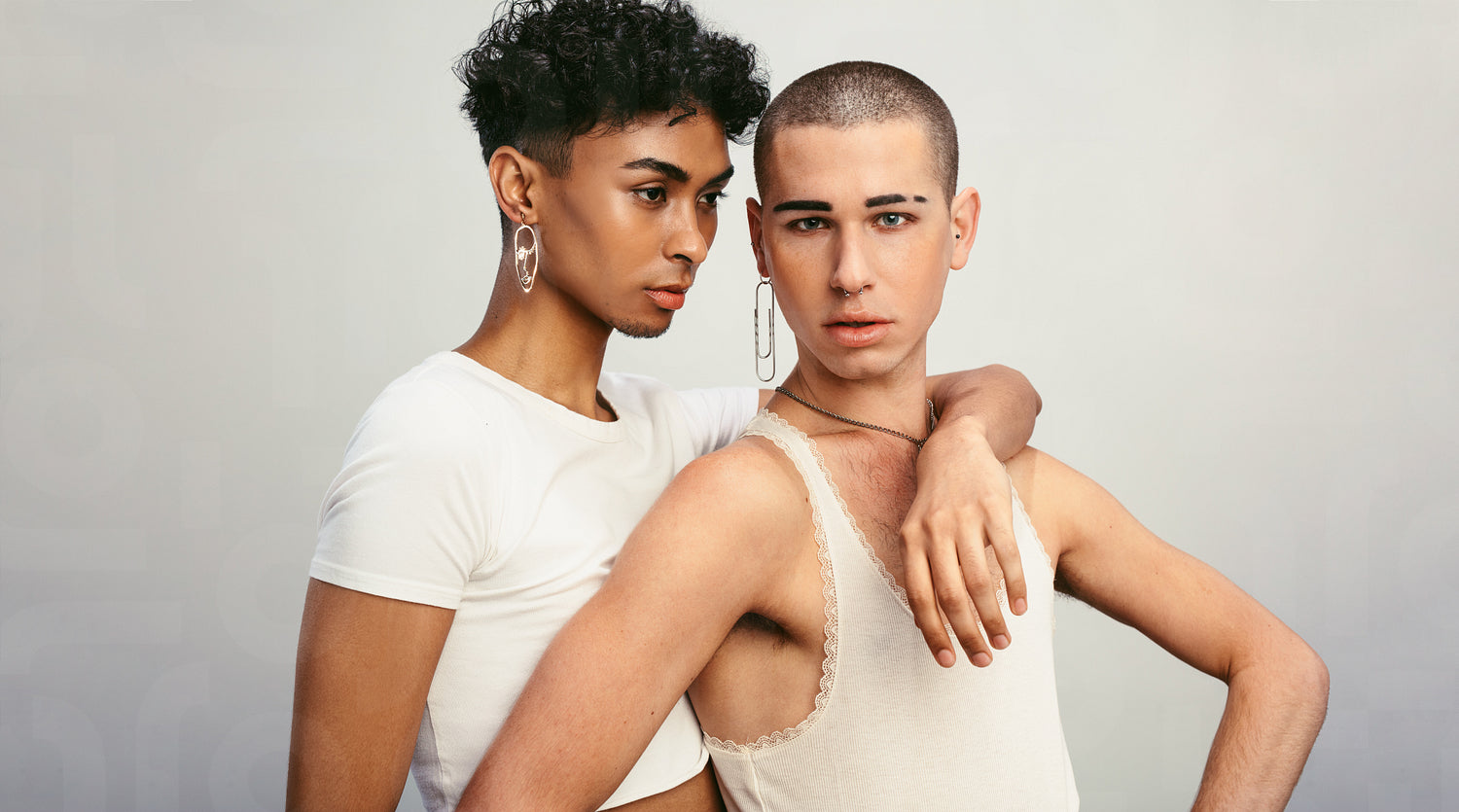 Two androgynous men in white tops posing together. Gay community members standing on white background.