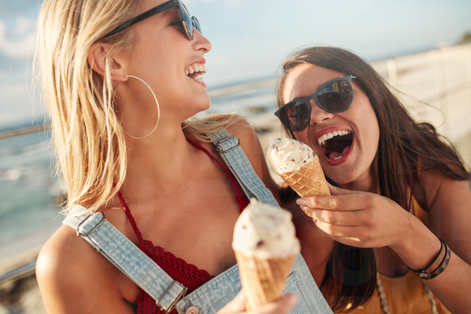 Two best friends having ice cream together outdoors. Close up of young women eating icecream and laughing.
