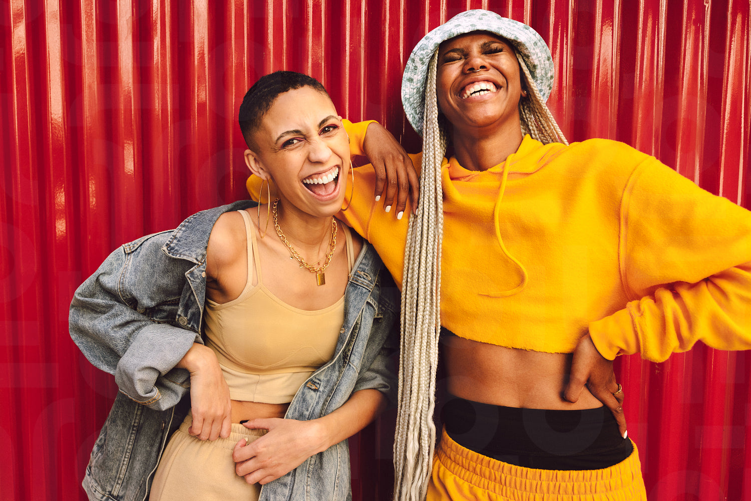 Two best friends laughing happily while standing together against a red background. Young female friends feeling vibrant and full of life. Two young women having a good time together.