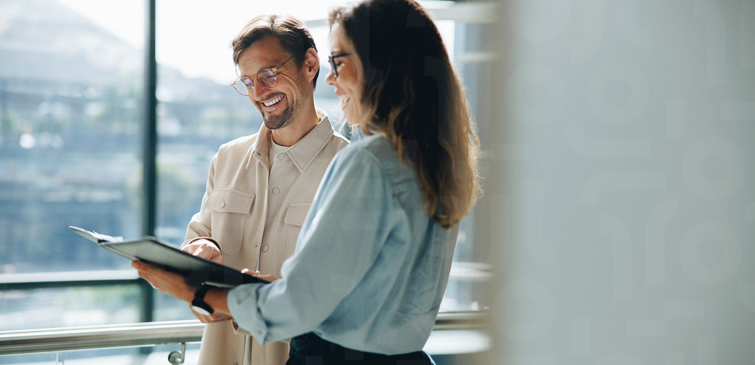 Business professionals going though a report document together in an office. Two business colleagues smiling as they read on the growth and success of their company.