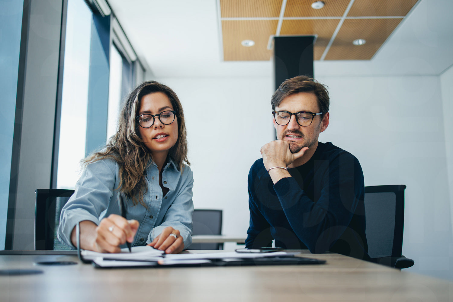 Two focused business professionals sit in an office, discussing and planning a project together. Entrepreneurs engaging in a collaboration, carefully strategizing to achieve their goals in the company.