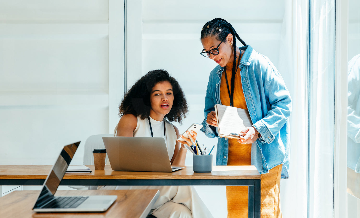 Two businesswomen collaborating with digital technology in a stylish, modern work environment