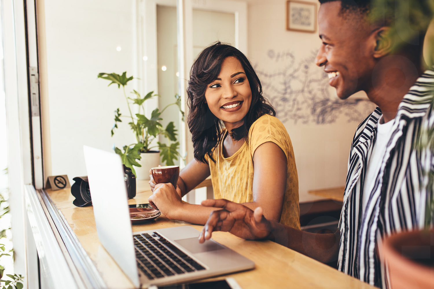 Two social media influencer meeting up at a cake and discussing over their new content. Man and woman sitting at cafe table with laptop.