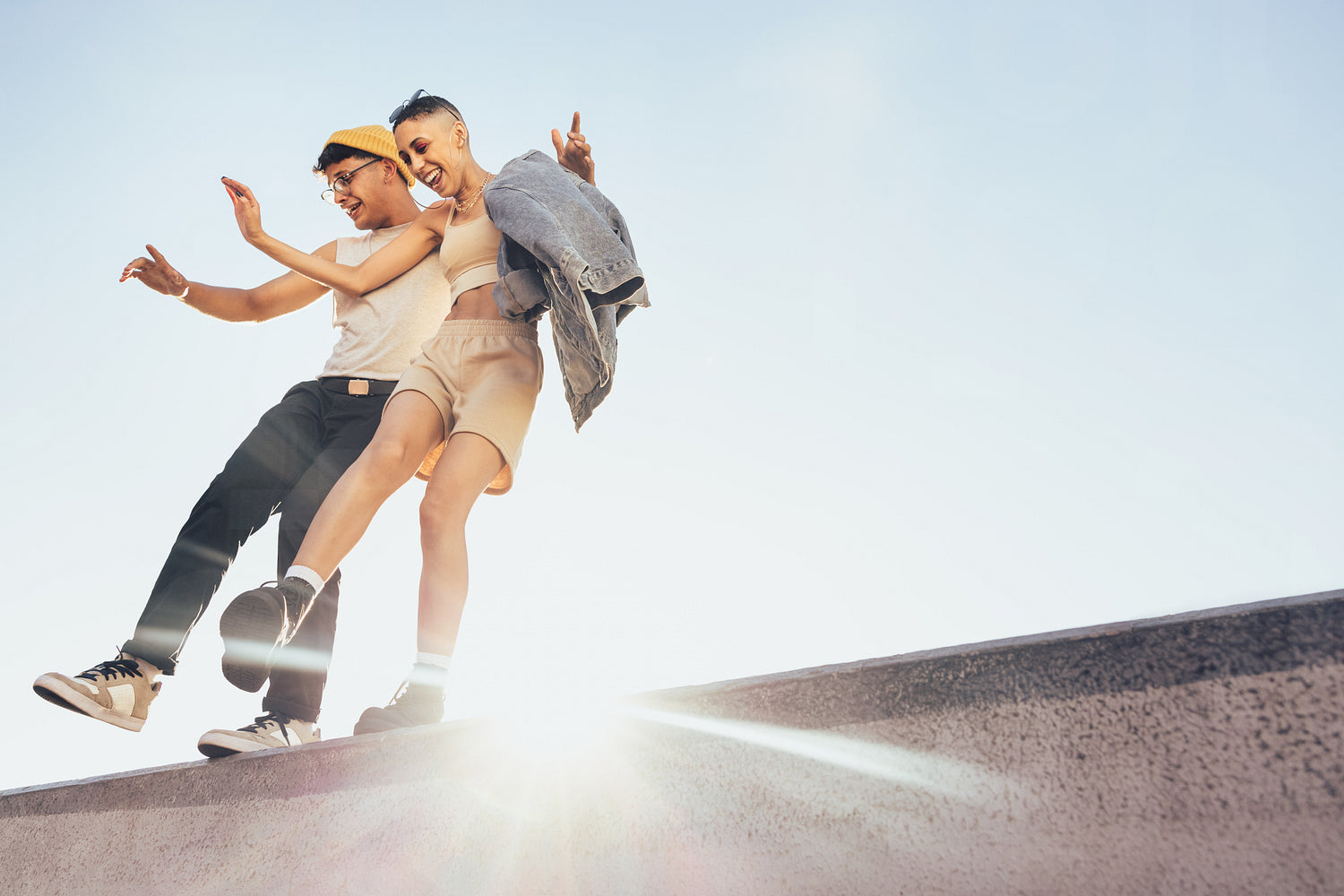 Two vibrant friends dancing and having fun outdoors. Two happy friends standing on a wall with the sky in the background. Young man and woman feeling energetic and full of life.