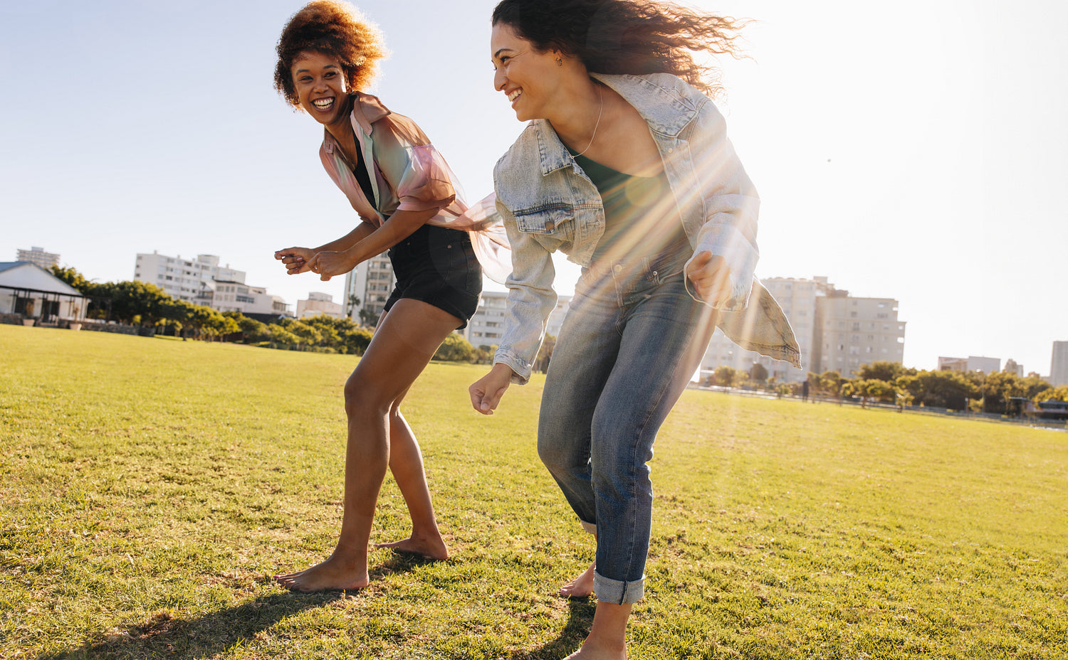 Two friends dancing together outdoors after school, enjoying summer in the park
