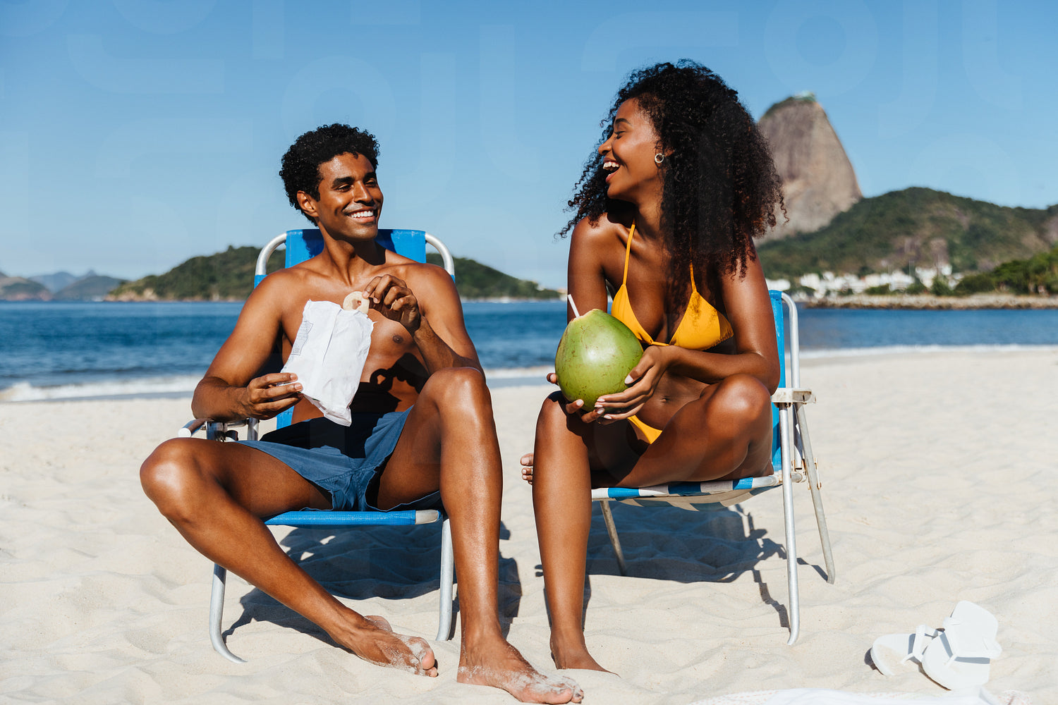 Two friends enjoying a sunny day on a beautiful beach in Brazil