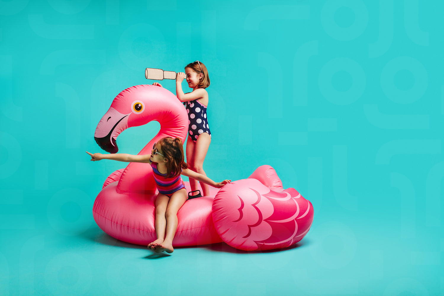Two girls on inflatable toy flamingo with binoculars. Small friends in swimsuits playing on inflatable mattress over blue background.