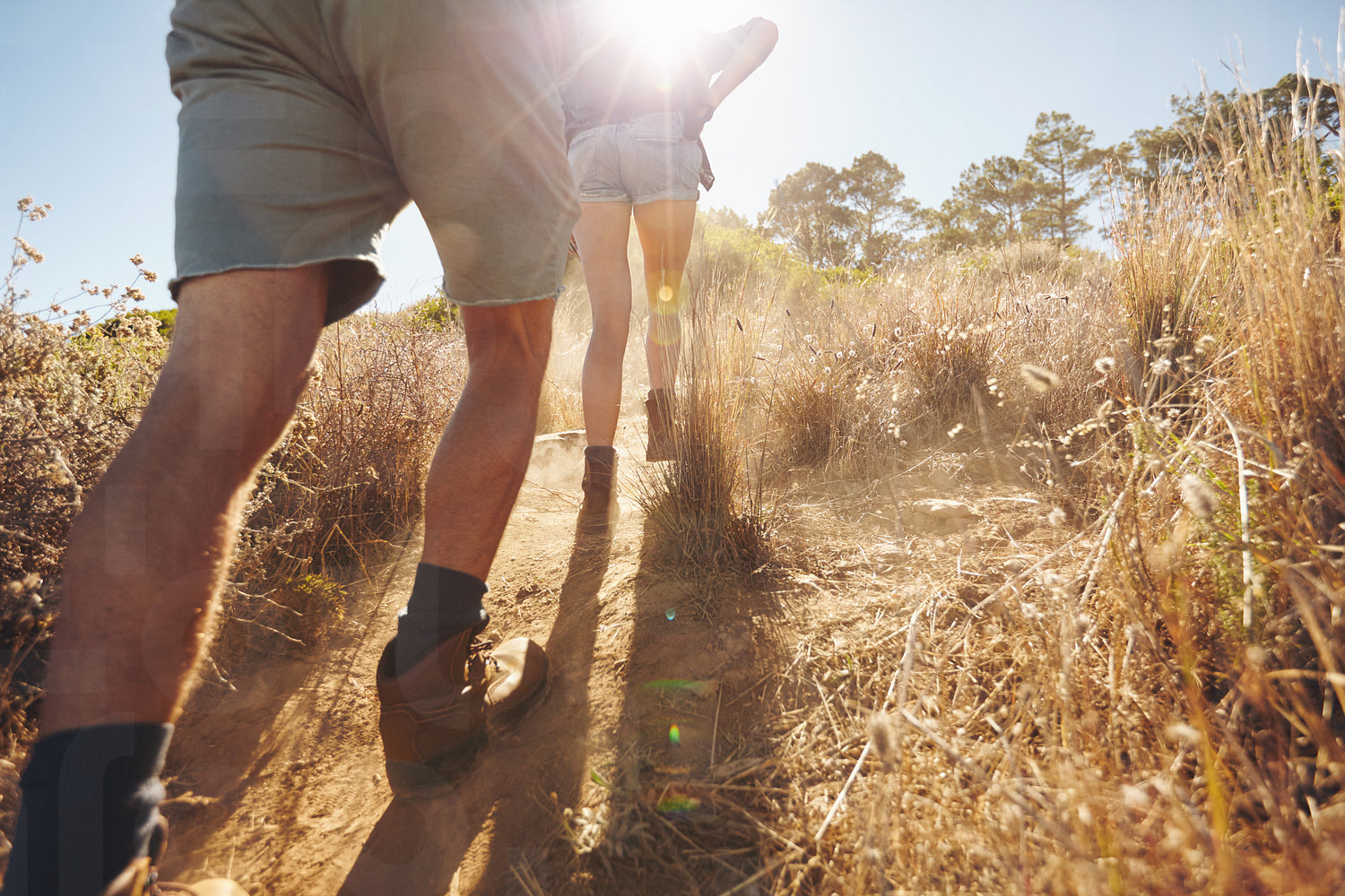 Rear view of two people going uphill on a mountain trail on hot summer day. Couple on hiking trip. Low section image with focus on legs.