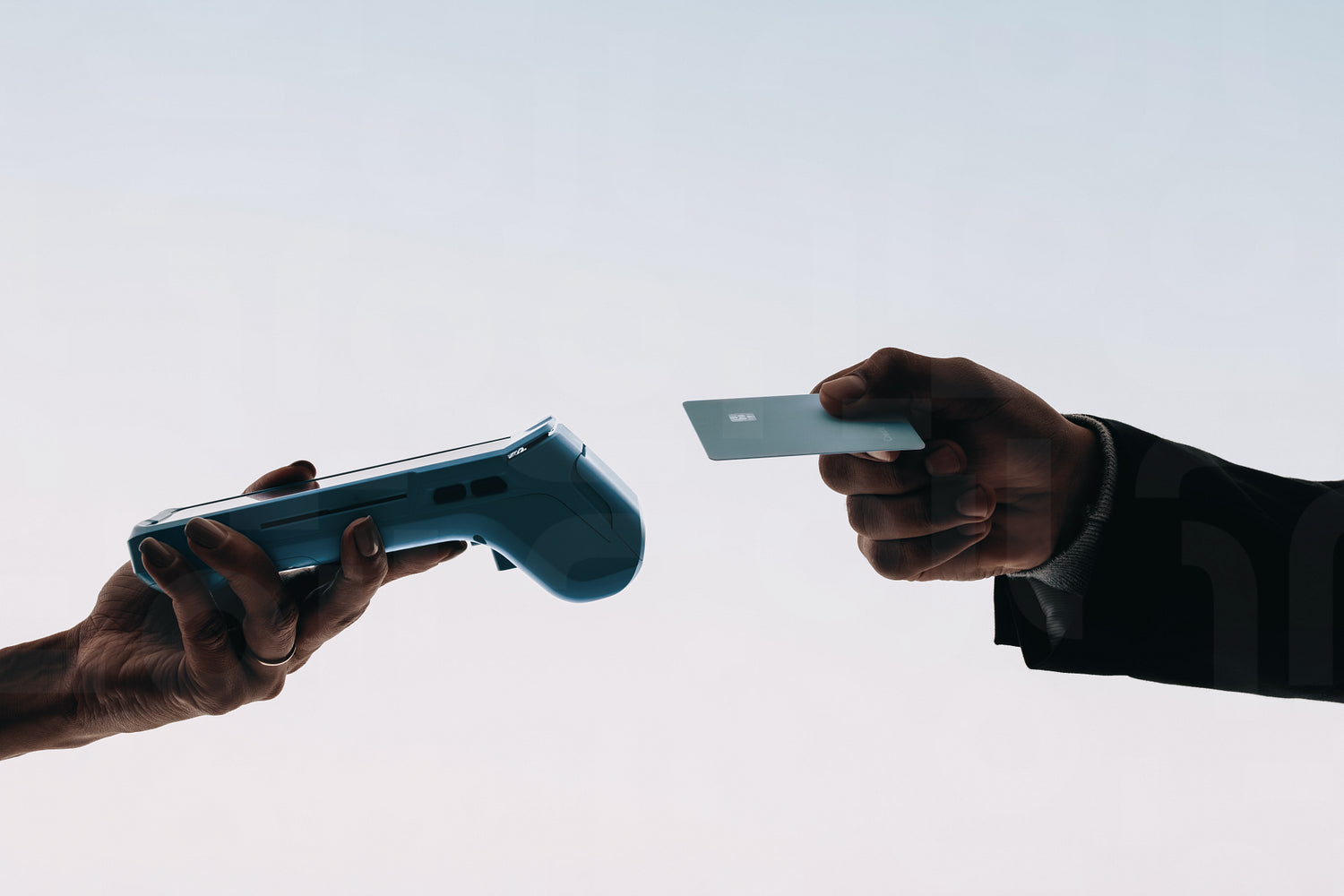 Two people using NFC technology for a contactless payment in a studio