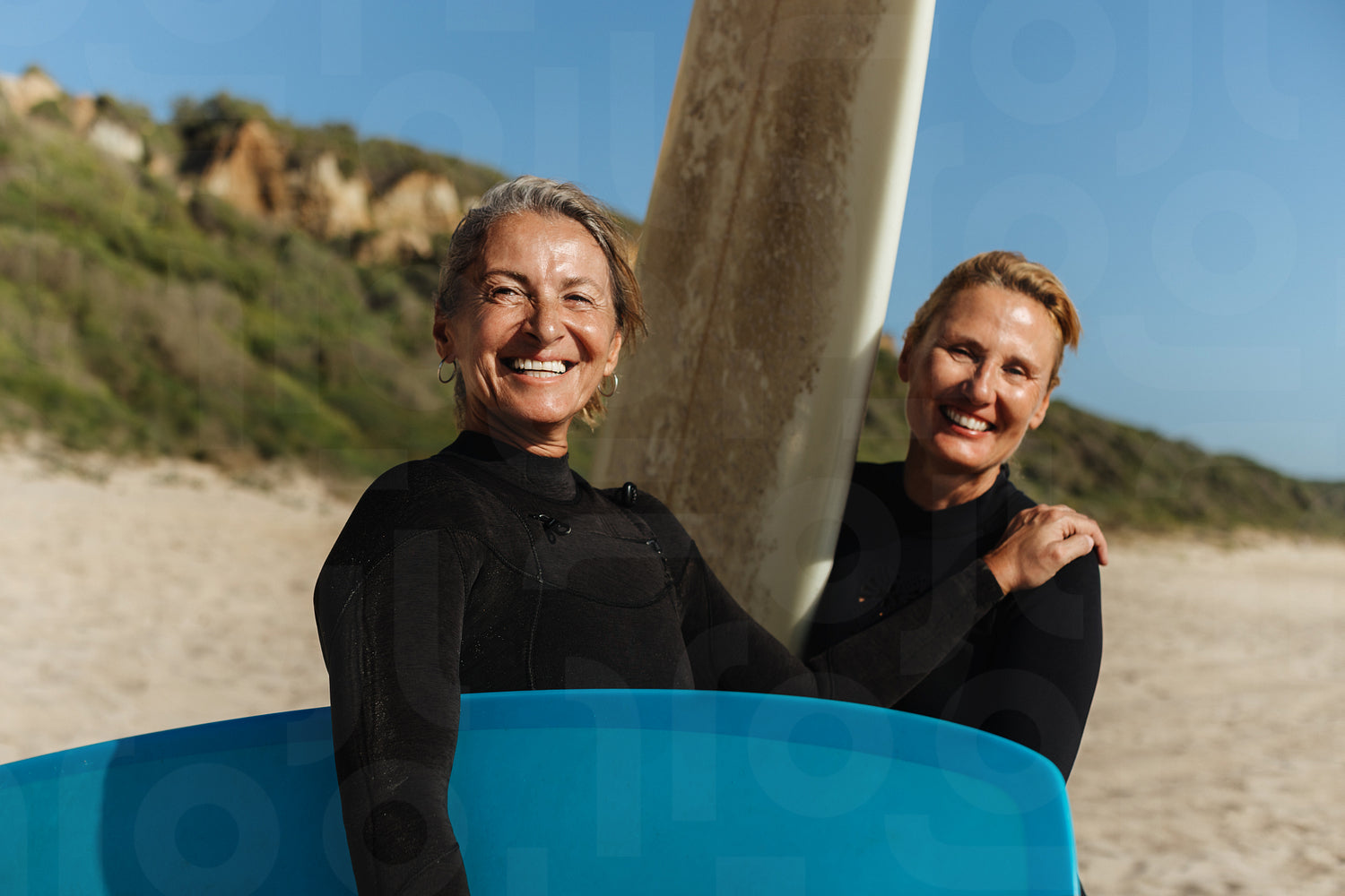 Two happy friends in wetsuits, standing on a beach and smiling with surfboards, ready for an exciting surfing adventure, enjoying the vibrant outdoors and the companionship of an active lifestyle.