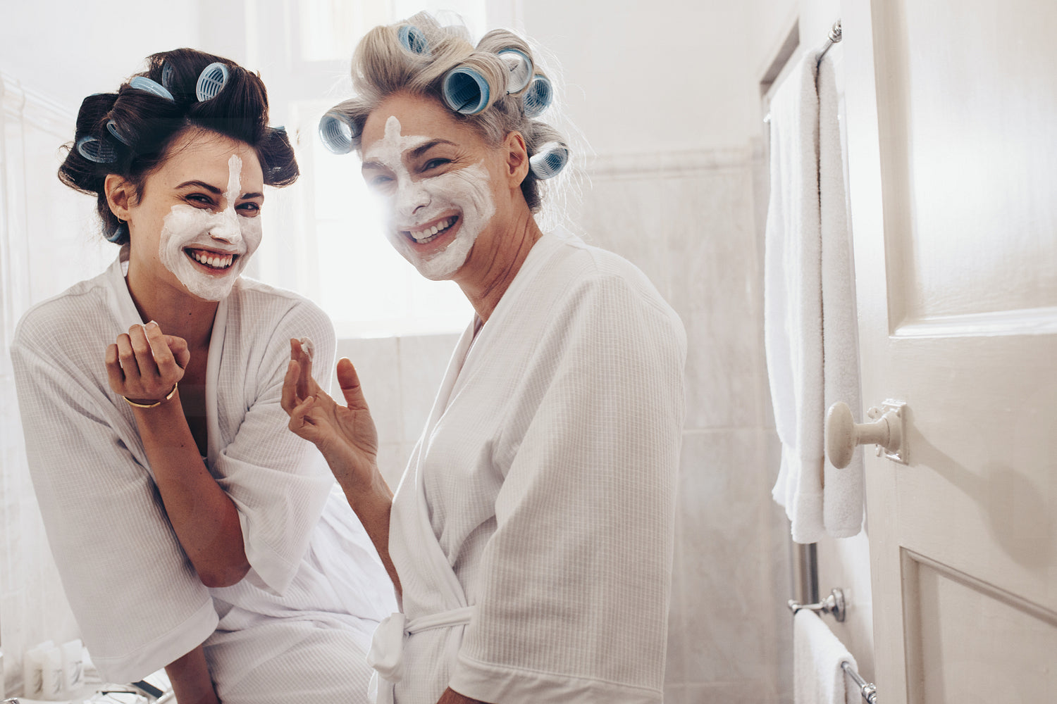 Women with curling rollers pinned to hair applying face cream standing in bathroom. Happy mother and daughter having fun grooming their face and hair.