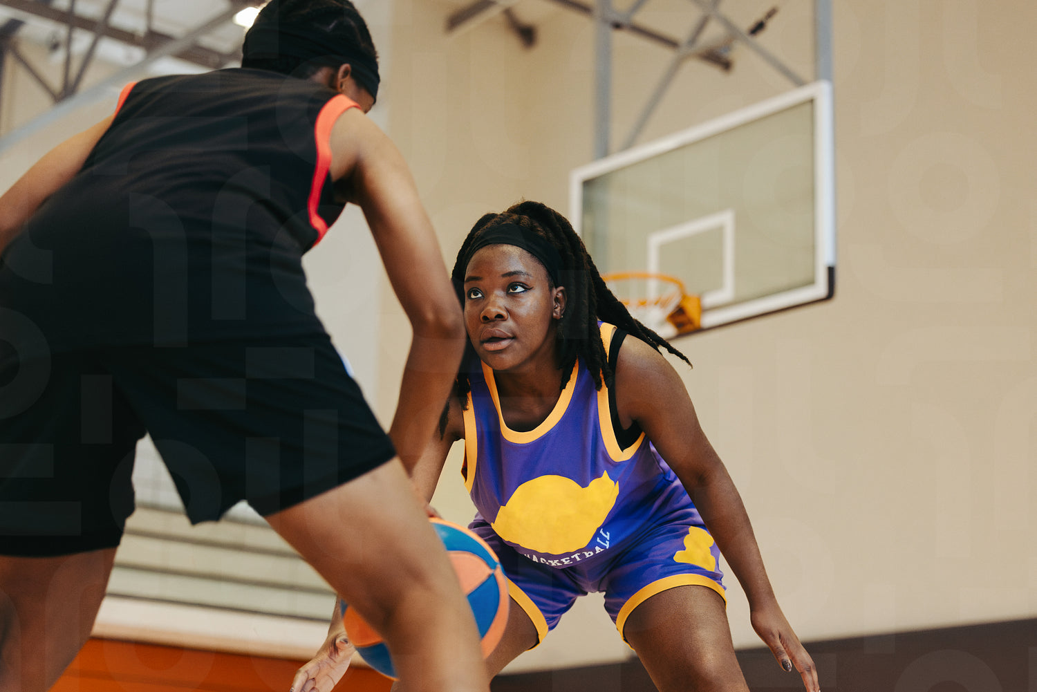 Two female athletes engaged in a competitive basketball match indoors, focusing intensely. Dynamic actions and sportsmanship, their determined expressions and movement demonstrate the excitement.
