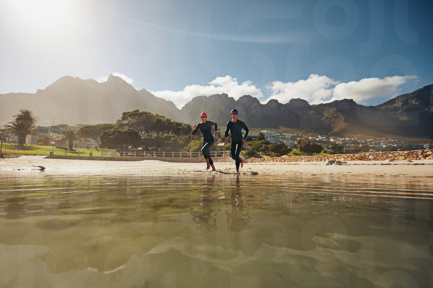 Shot of two athletes running into the water, practicing for triathlon competition. Young man and woman in wet suits preparing for the race at the lake.