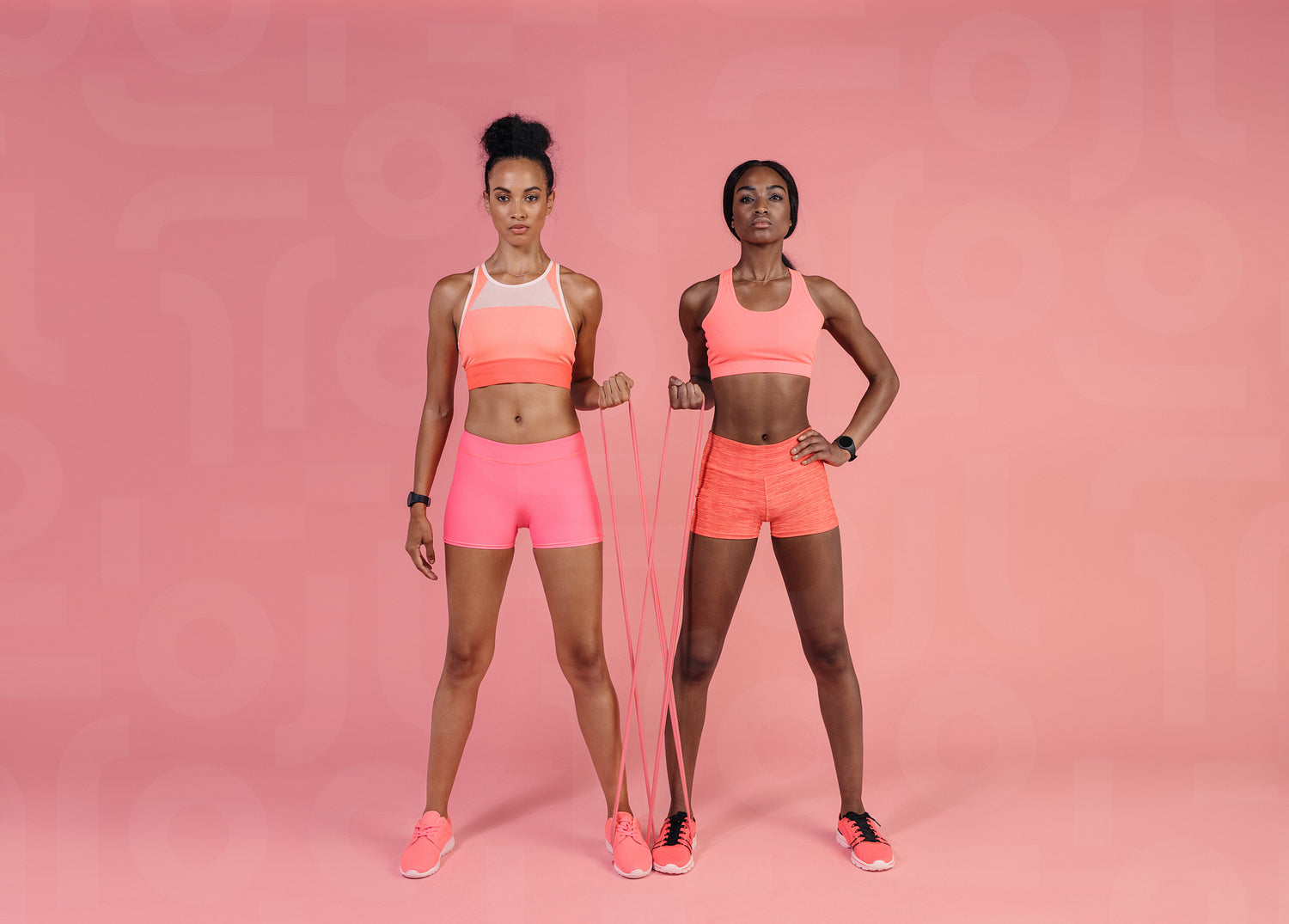 Two women doing exercises with resistance band over pink background. Fitness females working out with resistance band.