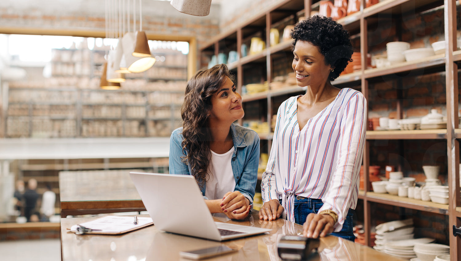 Two young ceramists smiling at each other while working in their store. Happy female entrepreneurs using a laptop together. Two young businesswomen running a successful small business.
