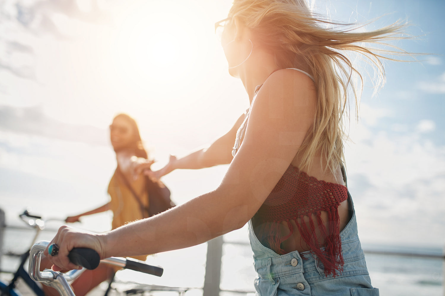 Two young female friends riding their bicycles on the seaside promenade. Female cyclist enjoying bike ride on a summer day.