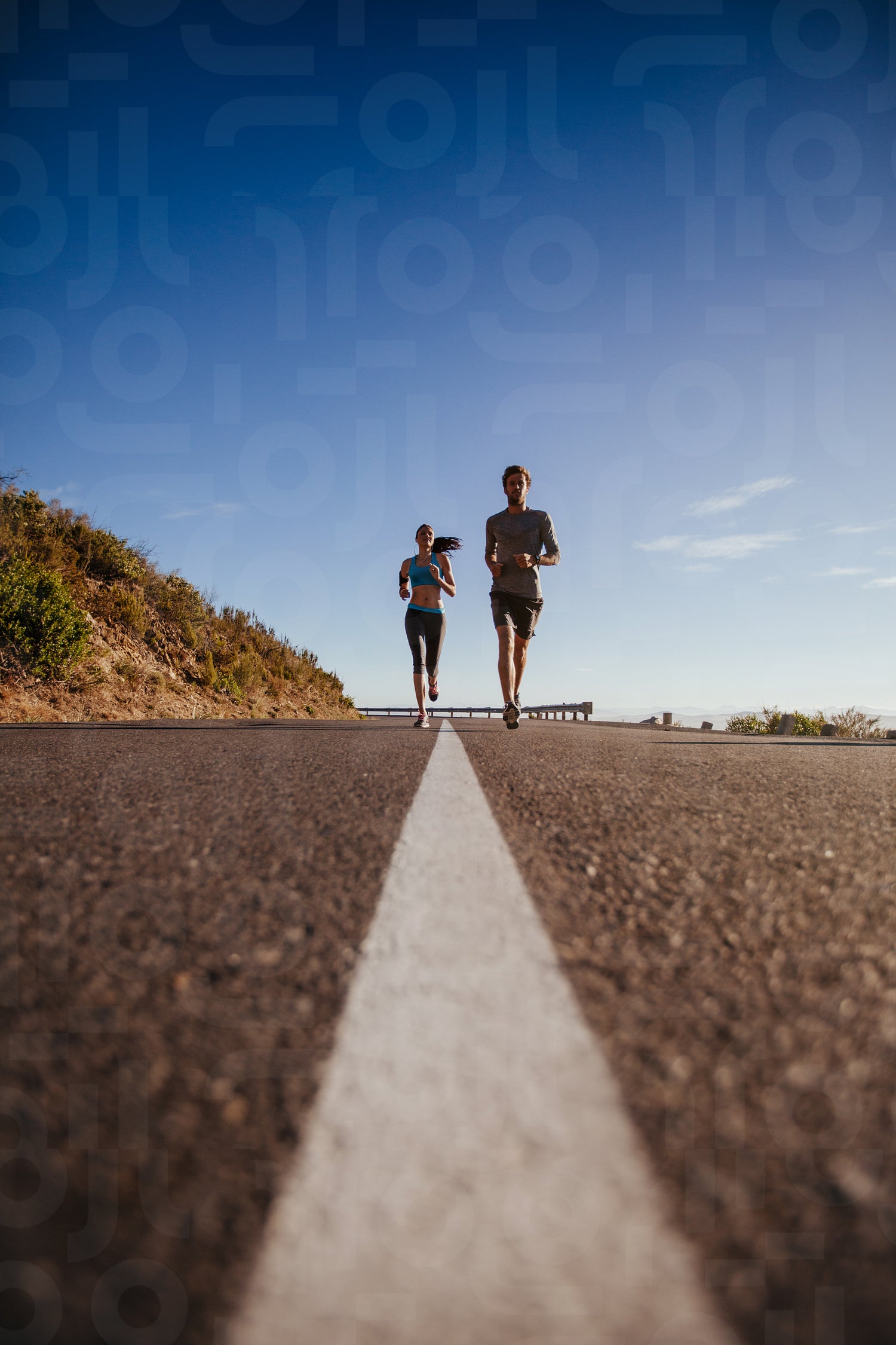 Low angle shot of two young people running on the road. Jogging on country road on a summer day.