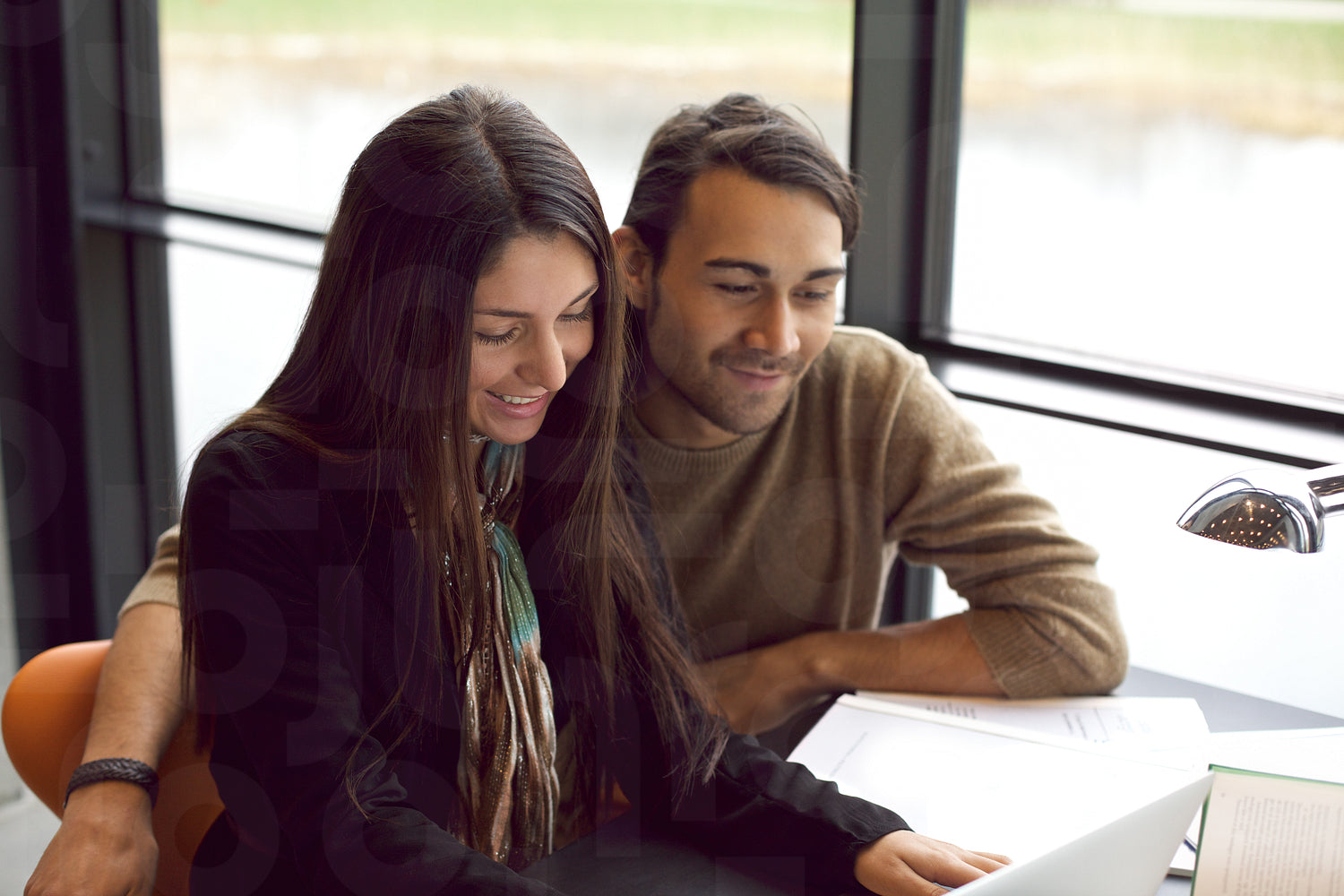 Two young students sitting together at table using laptop. Classmates with books and laptop for finding information for academic project in library.