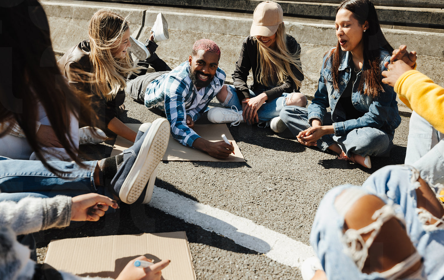 A diverse group of young people sit together on the street, engaged in protest planning activities during a demonstration. They exhibit unity and determination in support of human rights and equality.