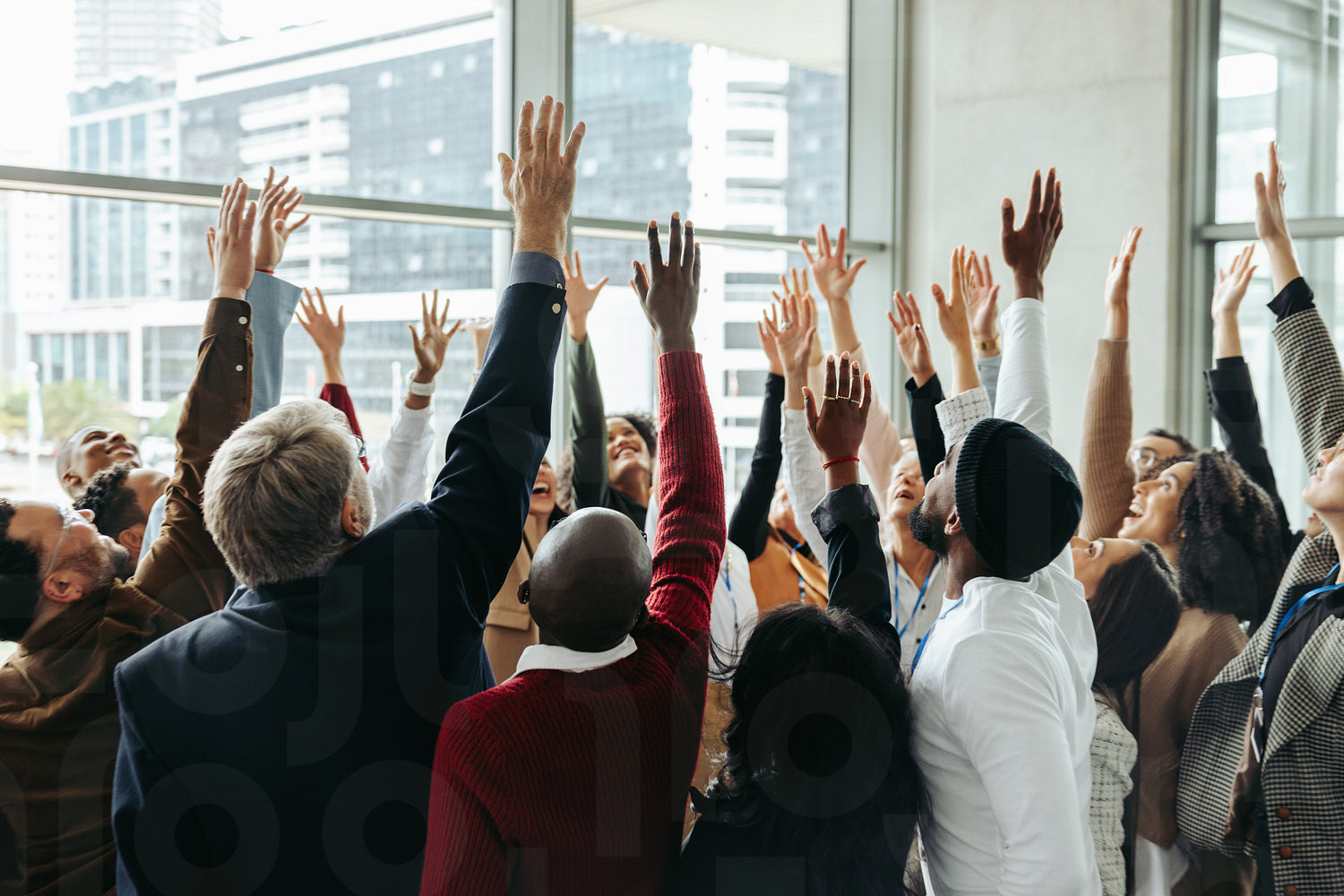 Diverse corporate team celebrates unity and success by raising hands together in a modern office environment, symbolizing achievement and teamwork.