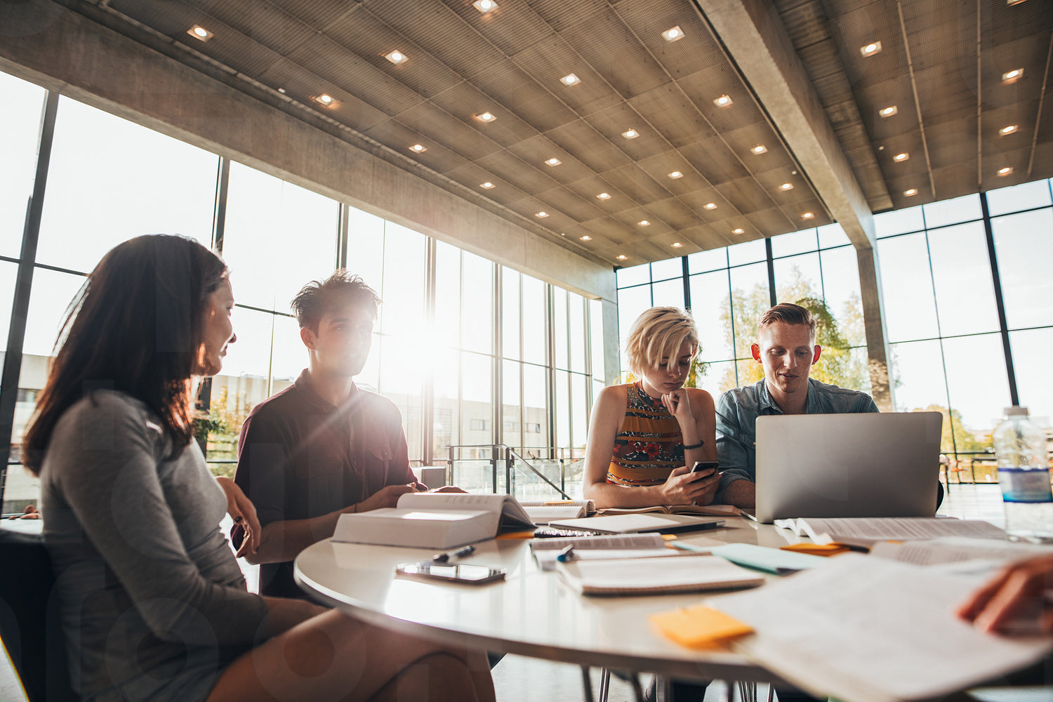 University friends studying together with books and laptop. Group of students sitting at table in library.