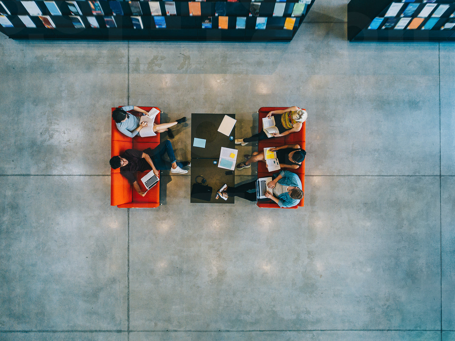 Top view of university students sitting in a library with books and laptop. Young people studying together at college library.