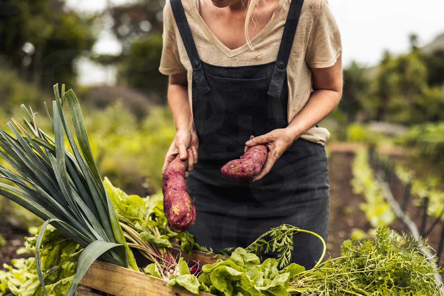 Unrecognizable woman arranging a variety of fresh vegetables into a crate. Organic female farmer gathering fresh produce in her vegetable garden. Self-sustainable young woman harvesting on her farm.